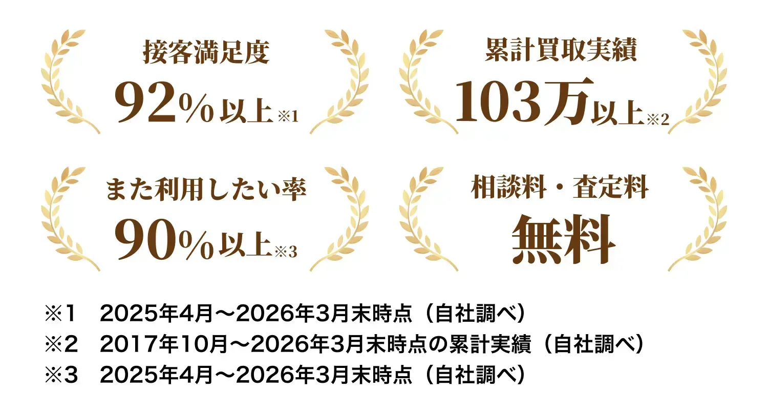 買取店舗 - 全国の百貨店・SC内に常設店44店舗出店(※2026年3月末時点) 買い取り催事を累計456回開催 (※2026年3月末時点) 百貨店での圧倒的な買取実績があります。
