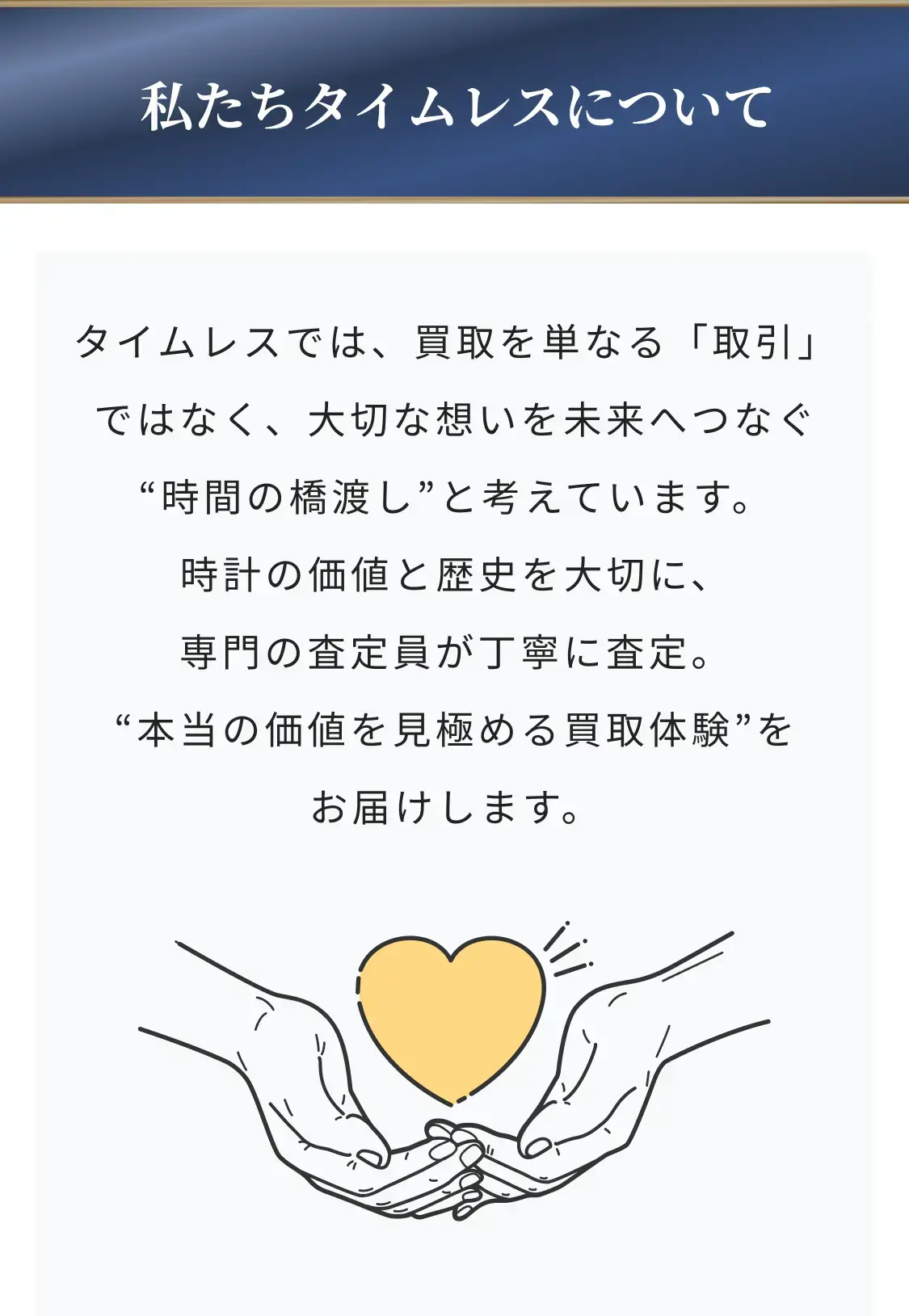 特定商取引法(第58条の14)クーリング・オフ制度とは訪問購入に係る売買契約の申し込みや締結が行われた場合であっても、法定書面(売買契約書)を受領した日を含めて8日以内であれば、当該売主たる消費者(申込者等)は書面又は電磁的記録により申込みの撤回や契約の解除ができるという制度です。より安心してお客様にご利用頂けるように、タイムレスでは訪問買取をさせて頂いたお客様に限り、契約日含め8日間以内のお申し出に関して返品保証を実施しております。 お客様第一主義に徹するタイムレスでは、サービス満足度向上の為に、全従業員が従事しております。 クーリング・オフ申請のみならず、契約に関するご相談は、「お客様相談室」にてお伺いさせて頂きますので、ご不明点・ご不安点があればご相談ください。 クーリングオフをご希望の際は担当店舗か、 0120-972-798 もしくは、 info@timeless-co.com までご連絡ください。依頼されて売却する場合(親族を含む)に必要なものは?