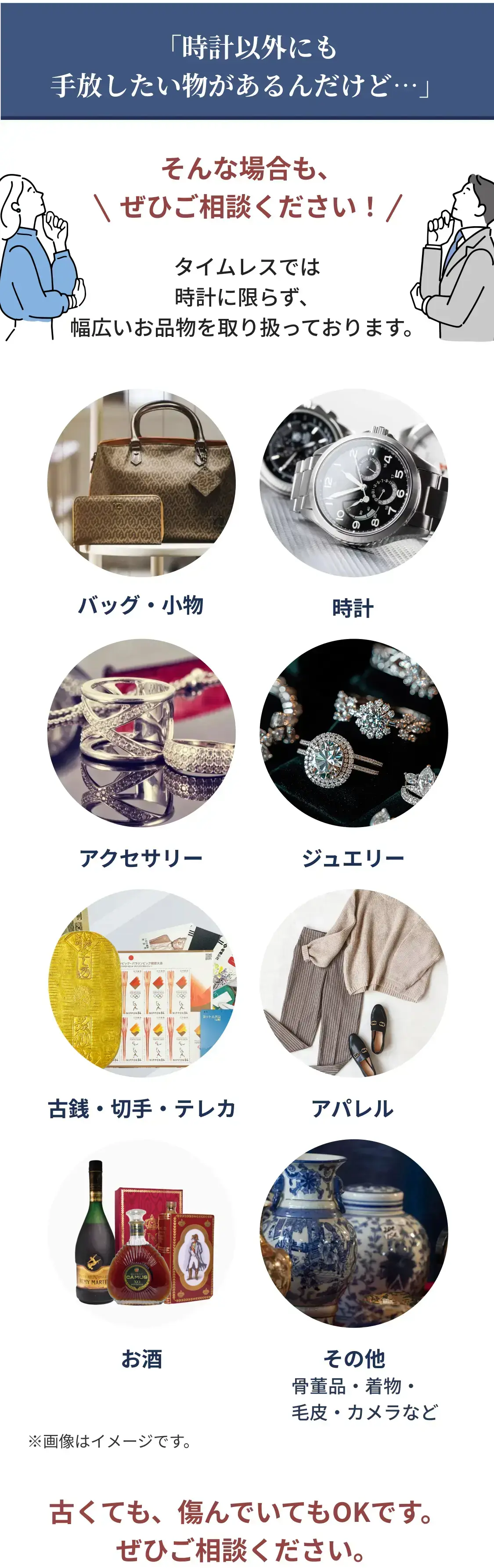 - ・買取したお品物のご返却は、原則として⼀切お受けいたしかねます。ご了承ください。